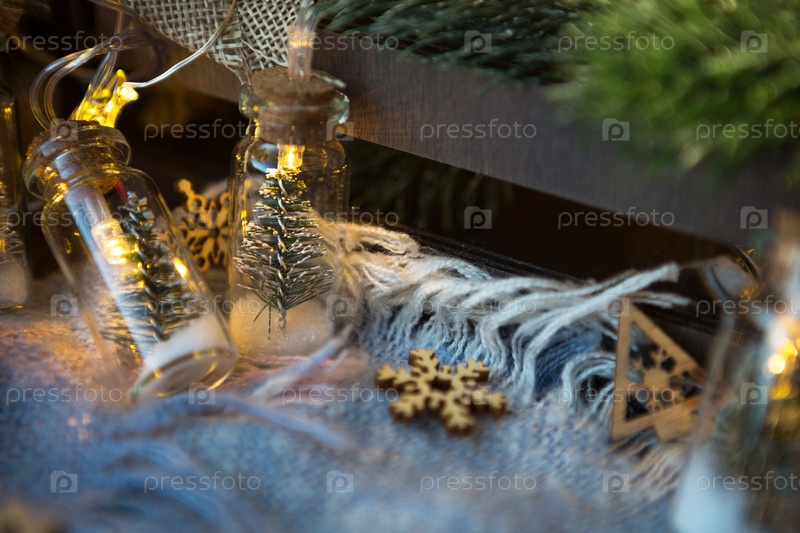 Сказочные огни в банке с елкой и снегом крупным планом на теплом уютном пледе с деревянным декором. Рождество и Новый год, праздничный декор, домашний уют, подготовка к празднику, сказочное настроение