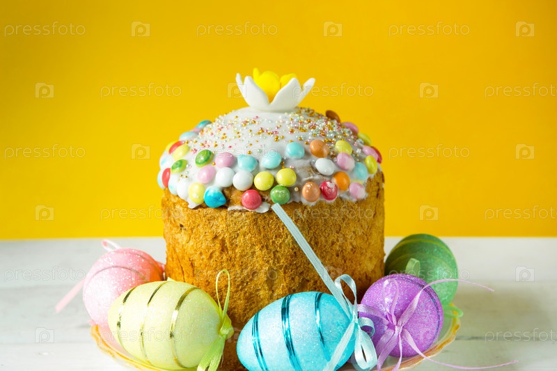 Пасхальный кулич с крашеными яйцами на блюде на белом столе. Традиционная праздничная еда. Желтый фон