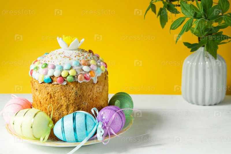 Пасхальный кулич с крашеными яйцами на блюде на белом столе. Традиционная праздничная еда. Желтый фон