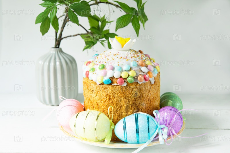 Кулич с крашеными яйцами на блюде в сером интерьере. Традиционная праздничная еда