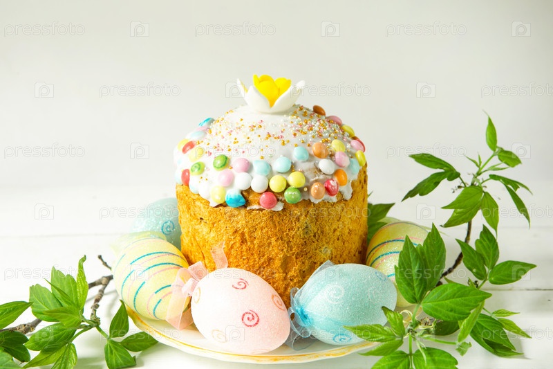 Кулич с крашеными яйцами на блюде в сером интерьере. Традиционная праздничная еда
