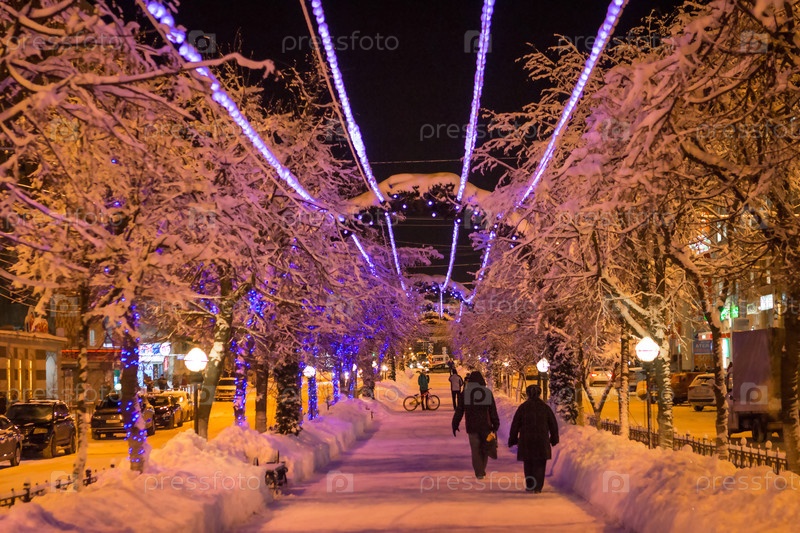 Праздничная аллея украшена гирляндами на Рождество и Новый год. Наружное оформление городских улиц, прогулка людей. Калуга, Россия, декабрь 2020 г