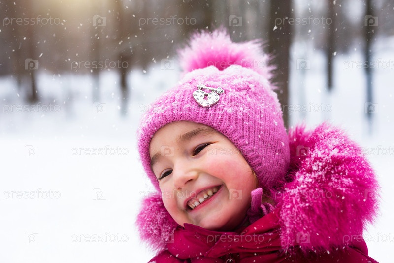 Маленькая девочка на морозе смотрит на снег и улыбается. Зима, прогулки с малышом на свежем воздухе, снег. Теплая одежда, вязаная шапка, меховой помпон и капюшон. Бой снежками, зимние забавы. Портрет крупным планом