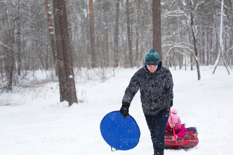 Папа катает дочку на тюбике с горки зимой в снегопад. Тюбинг, зимние виды спорта на открытом воздухе и семейные развлечения. Теплая одежда, вязаная шапка с помпоном. Помощь и поддержка, семейные ценности