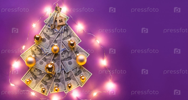 Рождественская елка из 100-долларовых купюр на фиолетовом фоне с копирайтом и ключом от дома. Рождественский декор финансов, сбережений, богатства, расходов в новом году. Недвижимость, жилье, ипотека, переезд