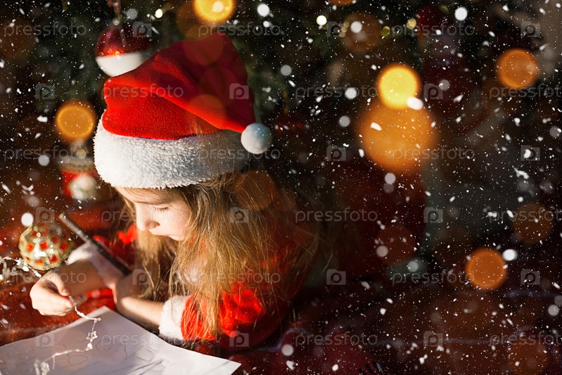 Маленькая девочка в шапке Санты и красном платье под елкой мечтает, ждет праздника, лежа на пледе. Письмо на листе бумаги, подарки. Новый год, Рождество. расфокусированные огни