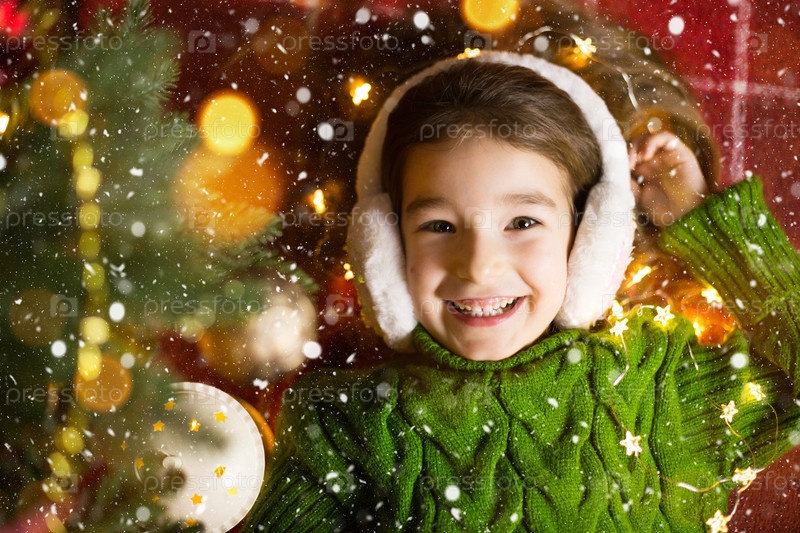 Счастливая девушка в меховых наушниках лежит возле елки в гирляндах и светится в теплом свитере на уютном одеяле. Рождество и Новый год, канун праздника, волшебное настроение