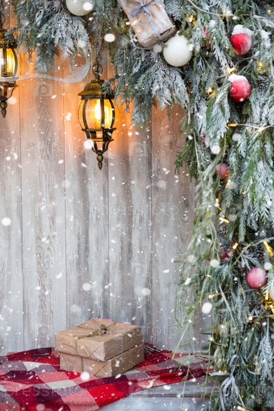 Коробки с подарками на Рождество в крафт-бумаге лежат на красном пледе возле уличной елки. Уличные украшения города, снег, новогоднее настроение, гирлянды