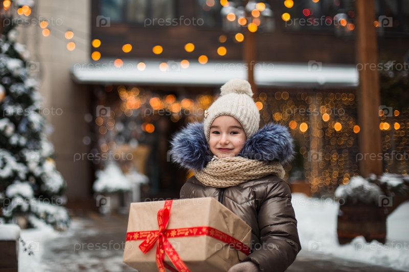 Портрет радостной девушки с подарочной коробкой на Рождество на городской улице зимой со снегом на праздничном рынке с украшениями и волшебными огнями. Теплая одежда, вязаная шапка, шарф и мех. Новый год