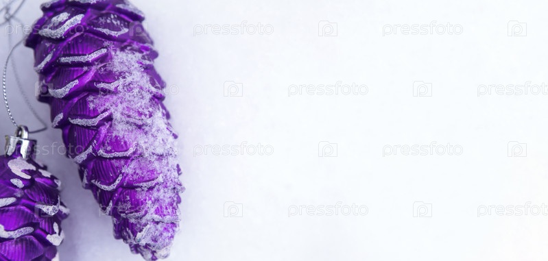 Фиолетовые елочные игрушки в виде шишек в снегу. Поздравительная открытка на новый год. Цвет очень пери пантон 2022. Копировать пространство
