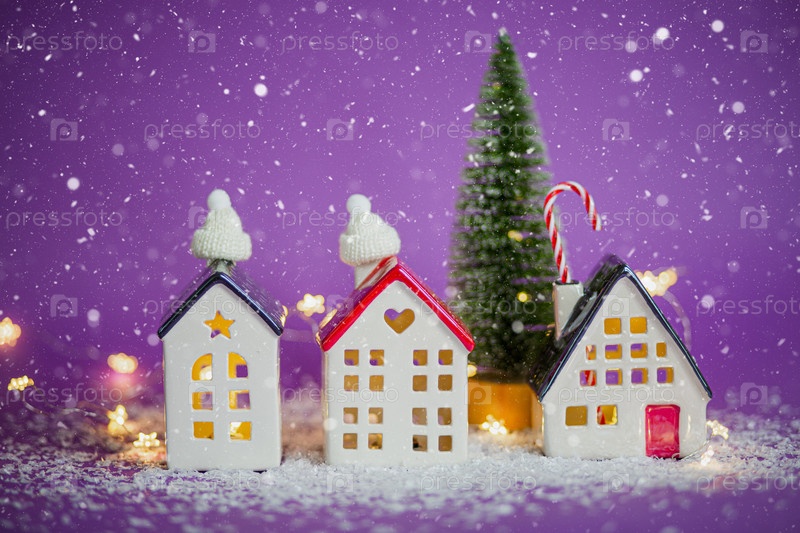 Уютные дома и рождественская елка в метель на фиолетовом фоне и волшебные огни. Зима, снег - утепление дома, защита от холода и непогоды. Праздничное настроение, рождественская, новогодняя открытка