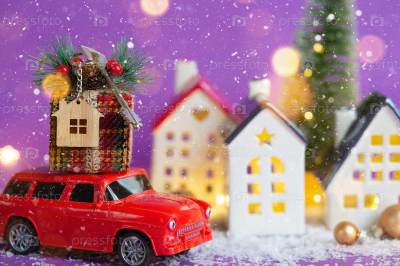Красный ретро-автомобиль на снегу несет подарочную коробку с ключом от дома с коттеджем на крыше мимо домов с гирляндами, рождественской елкой. Фиолетовый фон. Уютный Новый год. Недвижимость, переезд, ипотека
