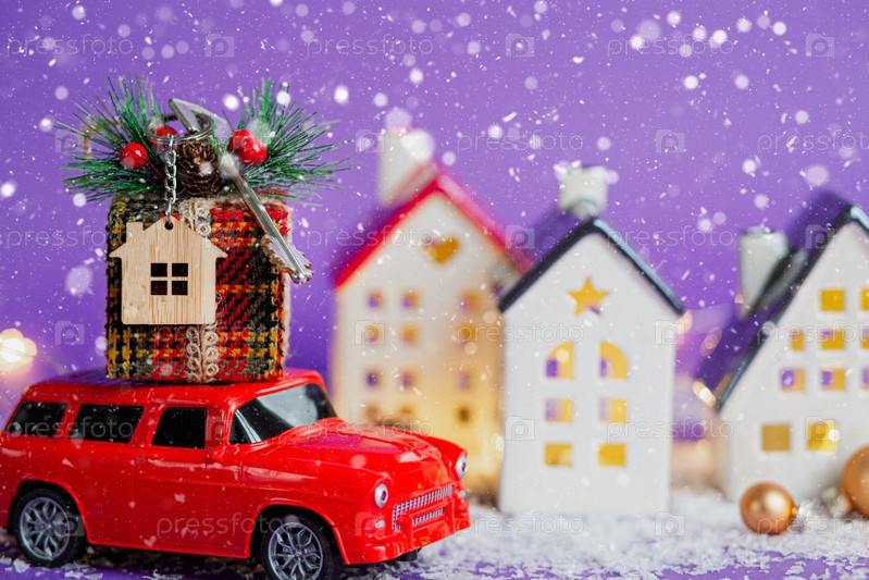 Красный ретро-автомобиль на снегу несет подарочную коробку с ключом от дома с коттеджем на крыше мимо домов с гирляндами, рождественской елкой. Фиолетовый фон. Уютный Новый год. Недвижимость, переезд, ипотека
