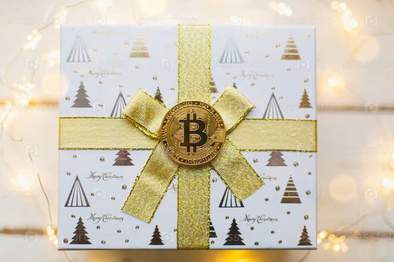 Биткойн-монета на коробке с подарком на Рождество и новый год. Криптовалюта, финансы, богатство и инвестиции. Сказочные огни, поздравительная открытка