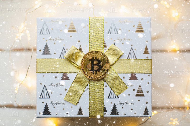 Биткойн-монета на коробке с подарком на Рождество и новый год. Криптовалюта, финансы, богатство и инвестиции. Сказочные огни, поздравительная открытка