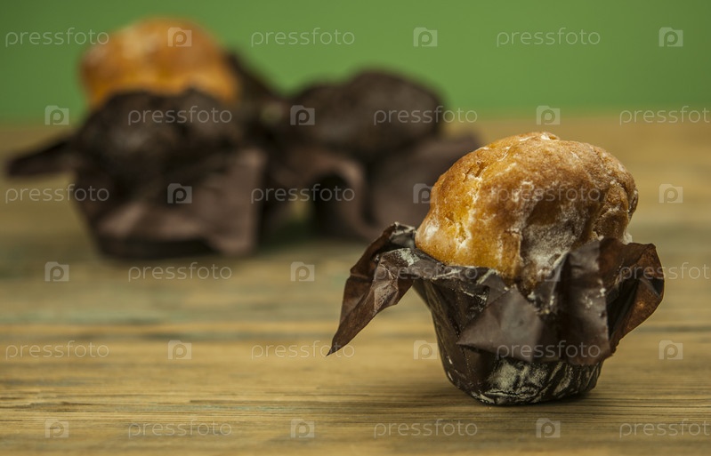 Домашние шоколадно-ванильные кексы на деревянном столе, посыпанные сахарной пудрой