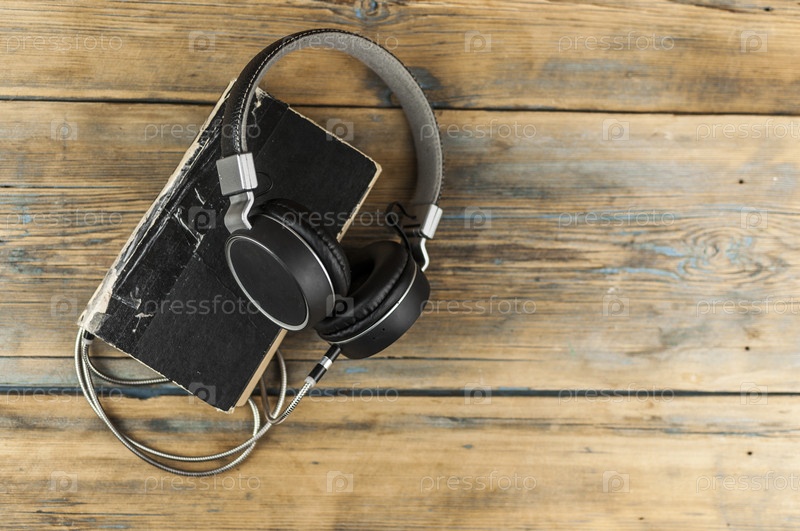 Концепция аудиокниги. Наушники и старая книга над деревянным столом. Вид сверху с местом для текста