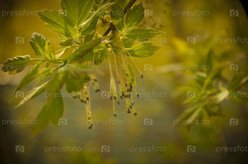 Первые весенние нежные листья, почки и ветки макрофон