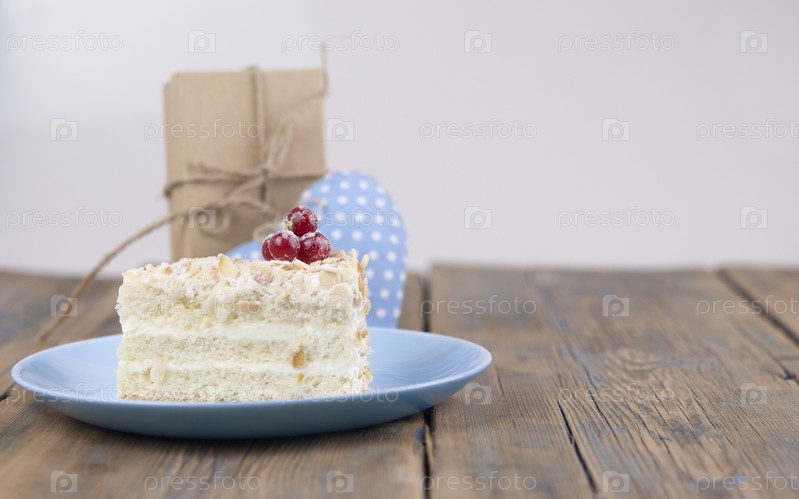 Вкусный кусок торта на тарелке на деревянном столе