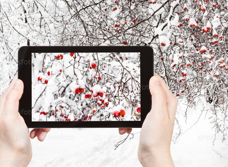 Заснеженные ягоды боярышника в лесу зимой
