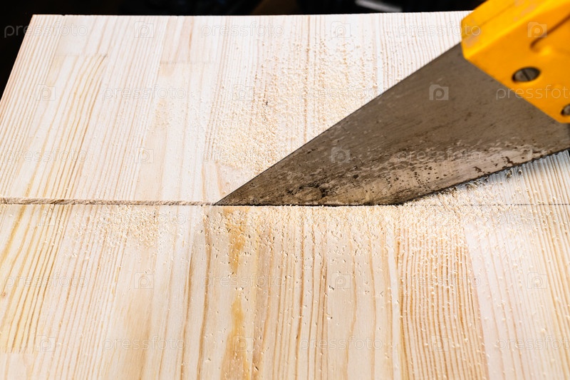 Вид сбоку на ручную пилу, распиливающую деревянную доску крупным планом