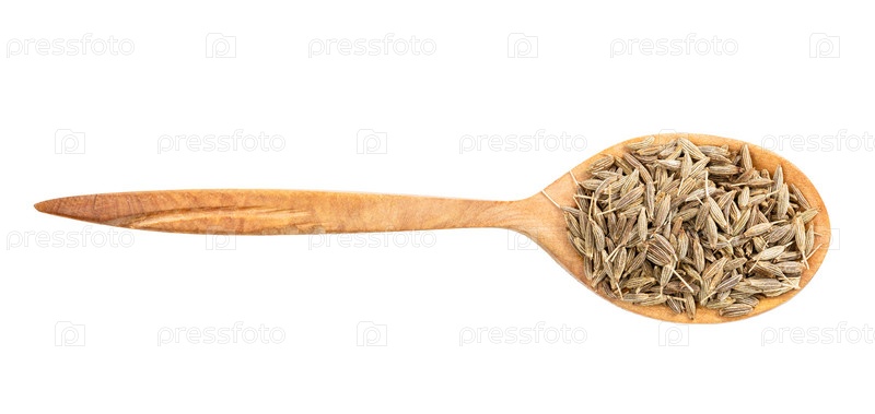Вид сверху на деревянную ложку с изолированными семенами тмина