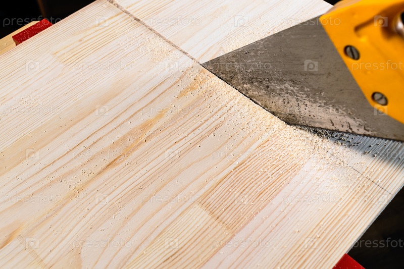Вид от первого лица на ручную пилу, распиливающую деревянную доску крупным планом