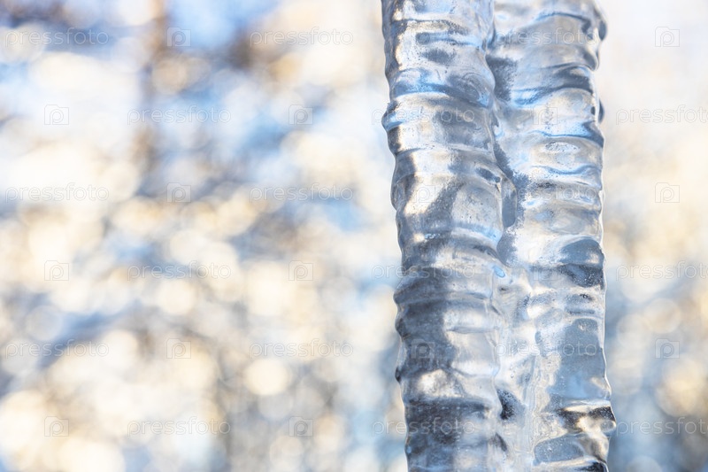 Сосулька крупным планом и размытые деревья на заднем плане