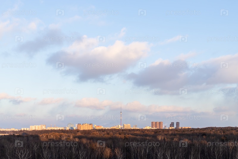 Закатное небо над городским парком и жилым районом