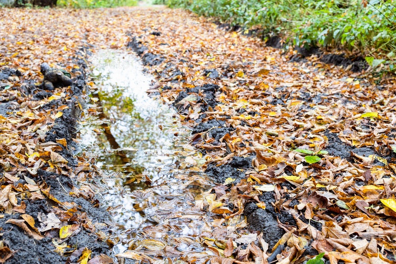 Лужа дождя в глубокой колее на грязной дороге крупным планом