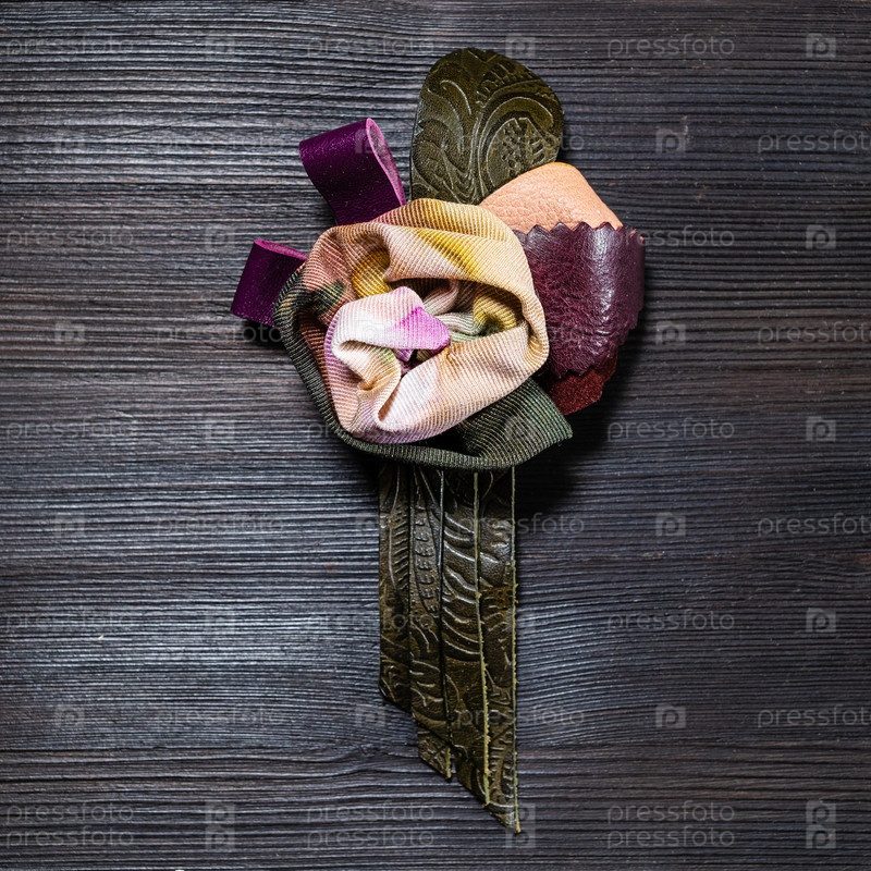 Вид сверху на кожаную и шелковую брошь в виде цветка розы