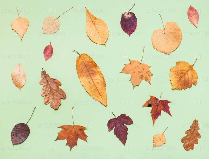 Различные сушеные осенние опавшие листья на светло-зеленом