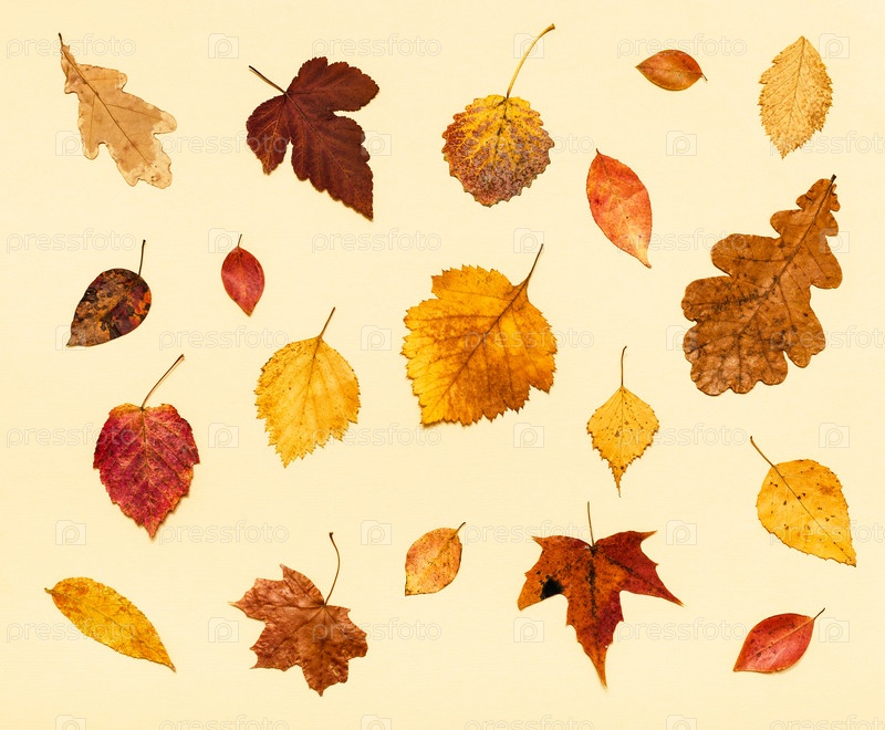 Много сухих осенних опавших листьев на светло-желтом