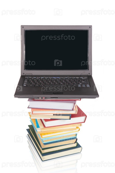 Ноутбук на стопке книг, коллаж