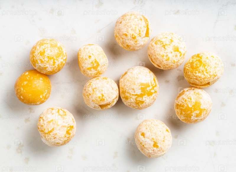 Несколько сушеных цельных желтых горошин крупным планом на сером