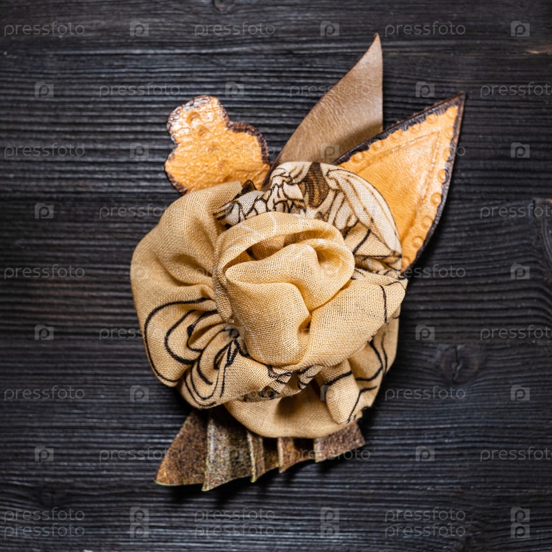 Вид сверху коричневая кожа и шелковая брошь в виде цветка