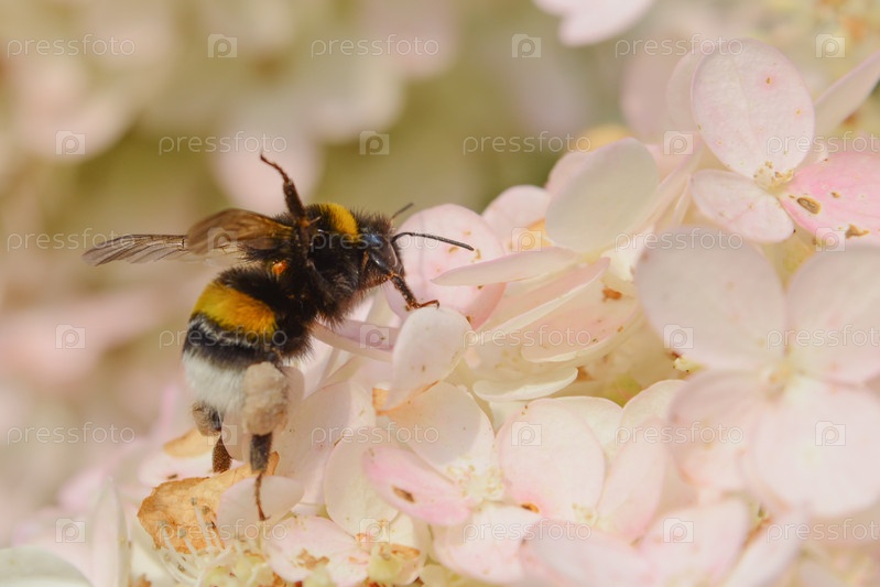Бумблби на красивом светло-розовом цвете Гидрензия цветок макро крупный план, естественный цветочный фон