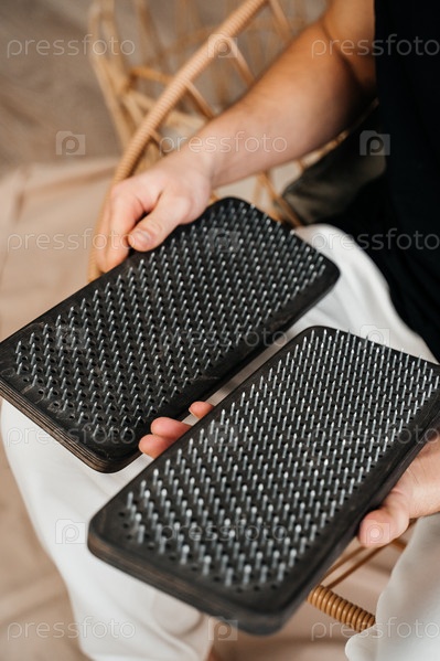 Мужчина держит в руках доску садху. Крупный план. Концепция здорового образа жизни