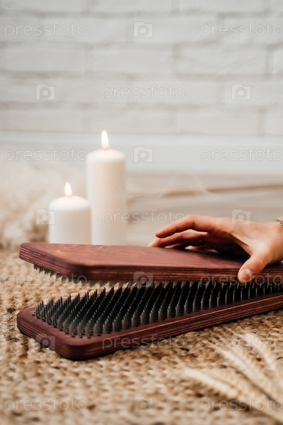 Девушка держит в руках доску садху. Крупный план. Белые свечи. Концепция здорового образа жизни