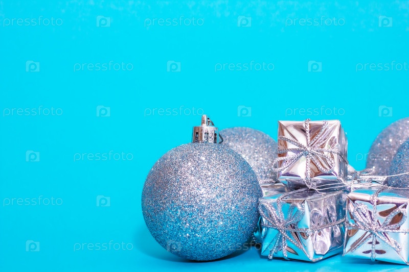 Новогодняя композиция. Подарок, рождественские серебряные украшения, мяч, звезда на синем фоне. вид сбоку, место для текста. концепция праздника. игрушки на елку, сосна