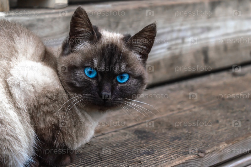 Сиамский кот с ярко голубыми глазами сидит на деревянной лестнице