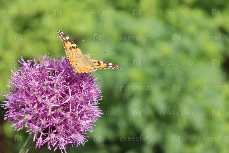 Бабочка сидит на лиловом цветке декоративного лука
