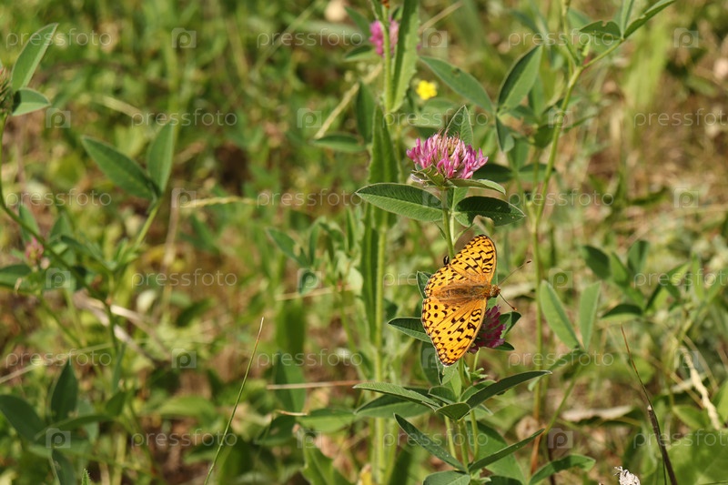 Оранжевая бабочка сидит на цветке клевера