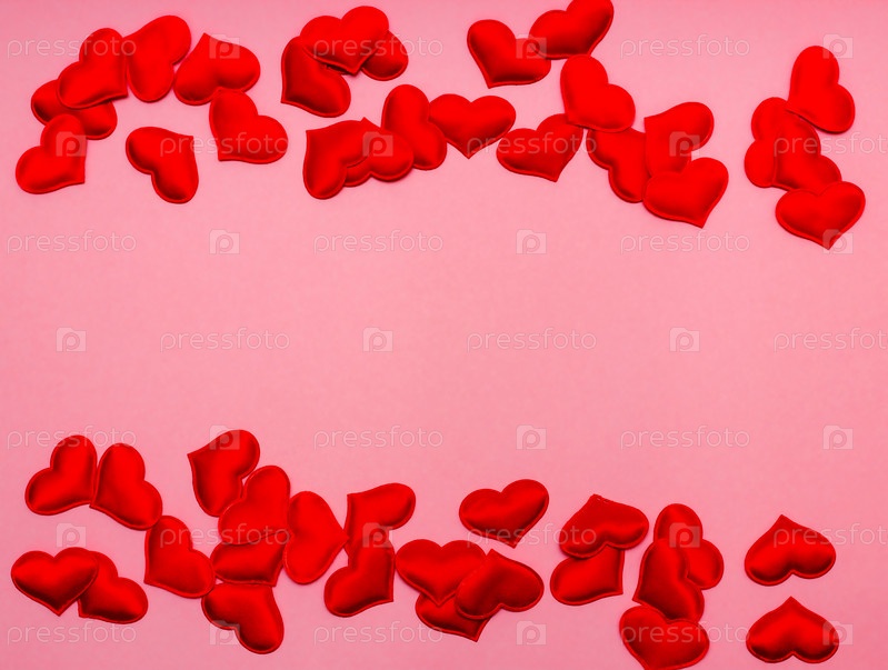 Рамка из красных шелковых сердец на розовом фоне. Концепция дня святого валентина, праздничная открытка. Вид сверху. Копировать пространство