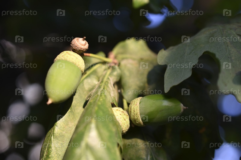 Зеленые орехи желуди дуба на дереве. Красивые семена дуба