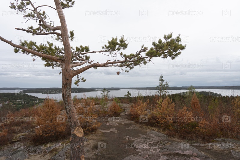Сосна на горе в Карелии. Пейзаж с озером