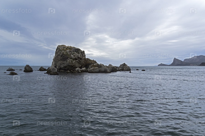 Небольшой каменистый остров. Крым, пасмурный день в сентябре
