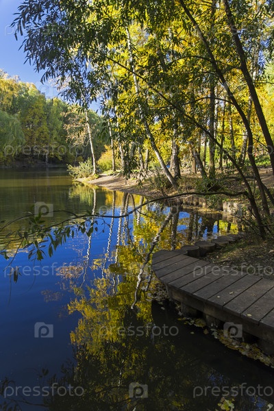Деревья с ярко-желтыми осенними отражаются в водной поверхности пруда. Ландшафтный заказник Теплый Стан, Москва, Россия. Солнечный день в октябре