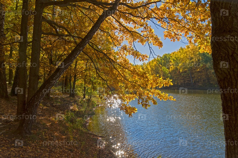 Деревья с ярко-желтой осенней листвой на берегу пруда. Солнечный день в октябре. Ландшафтный заказник Теплый Стан, Москва, Россия