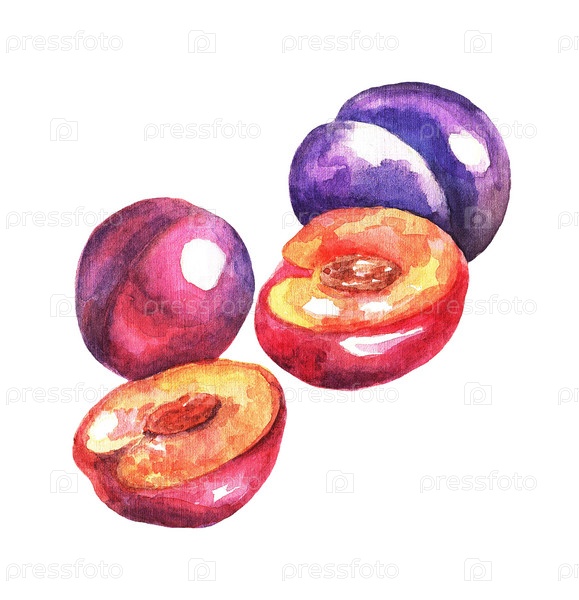 Несколько слив с половинкой, акварель